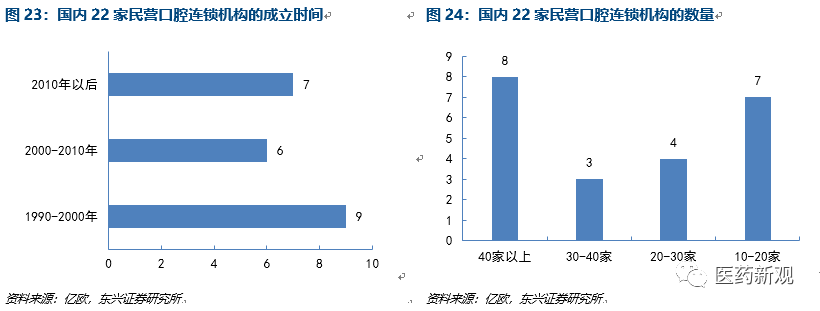 口腔機構(gòu)間的連鎖化發(fā)展逐漸呈現(xiàn)“馬太應(yīng)”。2010年以后,連鎖口腔機構(gòu)迎來新的增長期?;目谇粰C構(gòu)逐漸發(fā)掘中國市場,如美奧口腔、馬瀧齒科等,國內(nèi)外的口腔醫(yī)療機構(gòu)通過投資并購的多品牌連鎖模式實現(xiàn)連鎖化發(fā)展。其中有8家口腔機構(gòu)的連鎖數(shù)量達40家及以上,泰康拜博口腔連鎖數(shù)量約200余家,連鎖機構(gòu)的數(shù)量多;有7家口腔機構(gòu)的連鎖數(shù)量在10-20家,其中包括好牙醫(yī)口腔、可恩口腔、牙博士口腔等。另有,有3家連鎖數(shù)量在30-40家,有4家連鎖數(shù)量在20-30家。