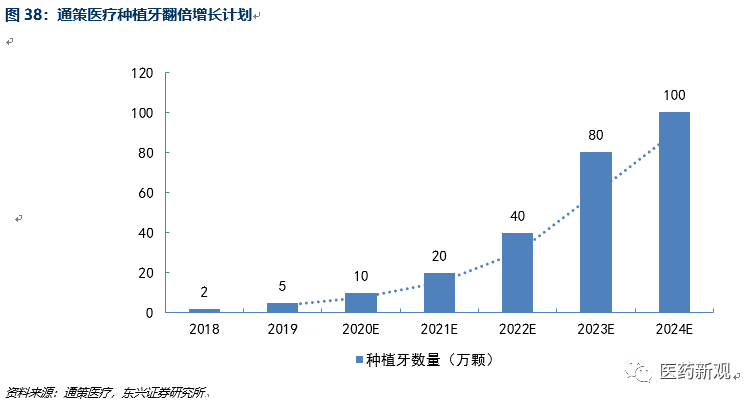 受益于種植牙行業(yè)的高速增長,公司提出倍增計劃。預(yù)計在2019年,公司種植牙數(shù)量有望達到5萬顆,預(yù)計5年內(nèi),種植牙數(shù)量按照每年倍增的速度增長至100萬顆。隨著種植牙規(guī)?;陌l(fā)展,未來種植牙的降價趨勢將逐漸,單價在1萬元以上的高端種植牙預(yù)計降價至約7000元左右,未來100萬顆種植牙貢獻收入合計約70億元以上。