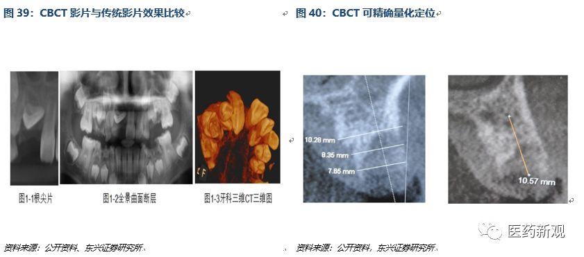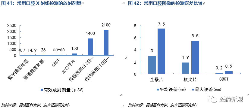 在口腔醫(yī)療領(lǐng)域技術(shù)優(yōu)勢,可替代傳統(tǒng)螺旋式 CT、全景機。CBCT的空間分辨率高,圖像拍攝誤差更低。臨床數(shù)據(jù)研究顯示,CBCT的診斷平均誤差僅為0.2mm,大誤差僅為0.5mm,相比全景片、根尖片檢測度更高。CBCT的放射劑量僅為55-66uSV,比較全景機放射劑量在150uSV,傳統(tǒng)CT的放射劑量在1400-2100uSV,使用更加可靠。