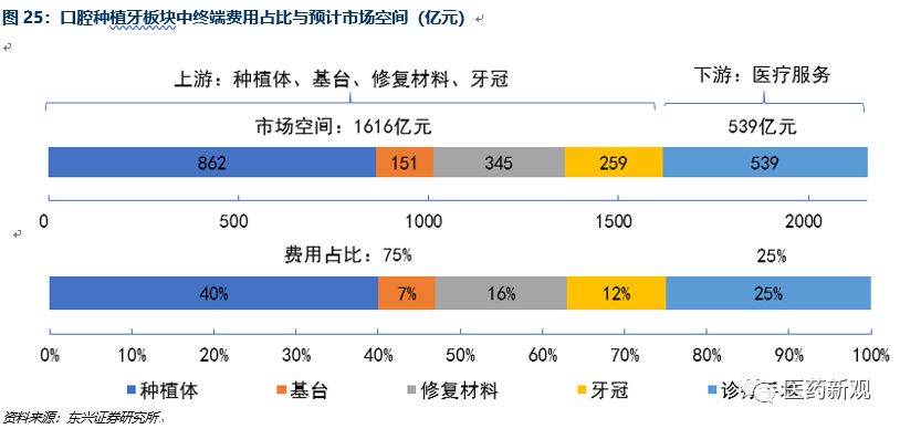 通過單顆種植牙的費用占比來看,產(chǎn)業(yè)鏈上游費用占比75%,其中種植體費用占比為40%,修復(fù)材料費用占比16%,下游的診療手術(shù)費用占比25%,估計上游市場空間約1616億元,下游診療服務(wù)市場空間為539億元。