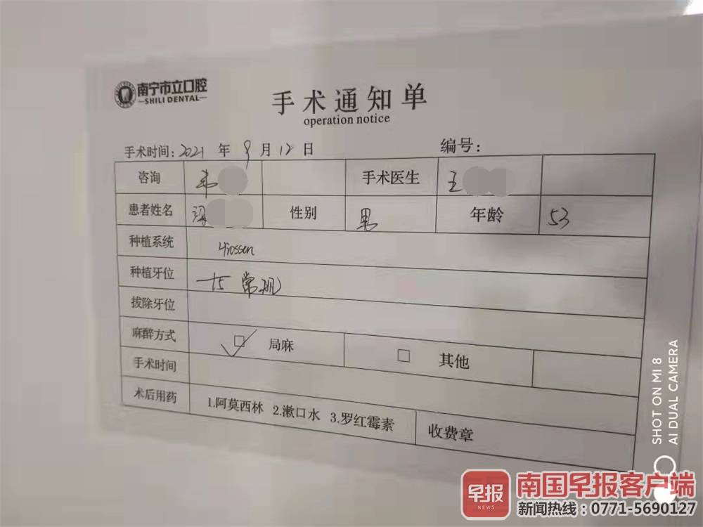 梁先生于9月12日進(jìn)行牙齒修復(fù)的手術(shù)通知單。 受訪者供圖