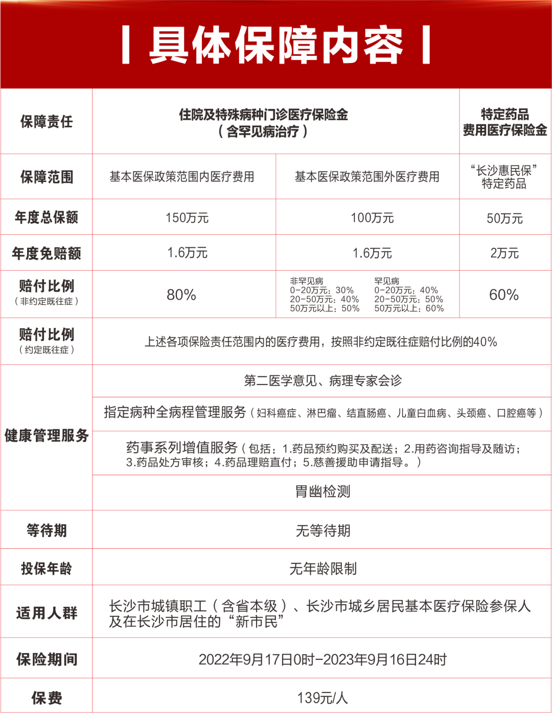 2022年“長沙惠民?!辈幌迲艏幌弈挲g,不限職業(yè),不限既往病史。只要是長沙市城鎮(zhèn)職工(含省本級)、長沙市城鄉(xiāng)居民基本醫(yī)療保險參保人及在長沙市居住的“新市民”均可參保!