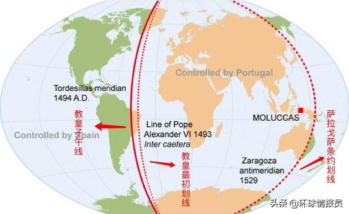 新航路開(kāi)辟以后,西、葡兩大西歐強(qiáng)國(guó)為了開(kāi)拓歐洲以外的世界,在海上展開(kāi)了激烈的領(lǐng)土競(jìng)爭(zhēng)和搶奪,羅馬教皇擔(dān)心他們會(huì)引發(fā)大戰(zhàn),所以便出面調(diào)停(教皇有決定非基督教地區(qū)歸屬的權(quán)力)。后在教皇的仲裁之下,這條用來(lái)瓜分世界的教皇子午線就誕生了。