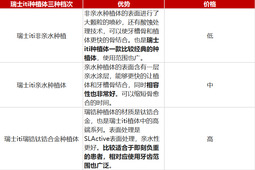 iti種植系統(tǒng)有三種不同系列分別是:親水性種植系統(tǒng)、非親水性種植系統(tǒng)和瑞鋯-鈦鋯合金SLA系列。價格大概在13000~20000元,種植體和基臺間呈中空柱狀結(jié)構(gòu),能較快實現(xiàn)骨生長。親水性種植系統(tǒng)具有較好的骨誘導(dǎo)功能,牙槽骨在3—4周就可以快速愈合,而非親水性種植系統(tǒng)大概在2—3個月時間才能和骨結(jié)合。