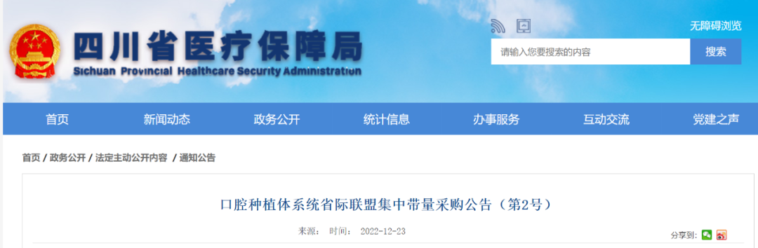 1.種植牙集采即將開標(biāo)12月23日晚,據(jù)四川省醫(yī)療保障局官網(wǎng)信息,口腔種植體系統(tǒng)集采規(guī)則《口腔種植體系統(tǒng)省際聯(lián)盟集中帶量采購(gòu)文件》正式發(fā)布。文件顯示,種植牙集采計(jì)劃于2023年1月11日在成都正式開標(biāo)。