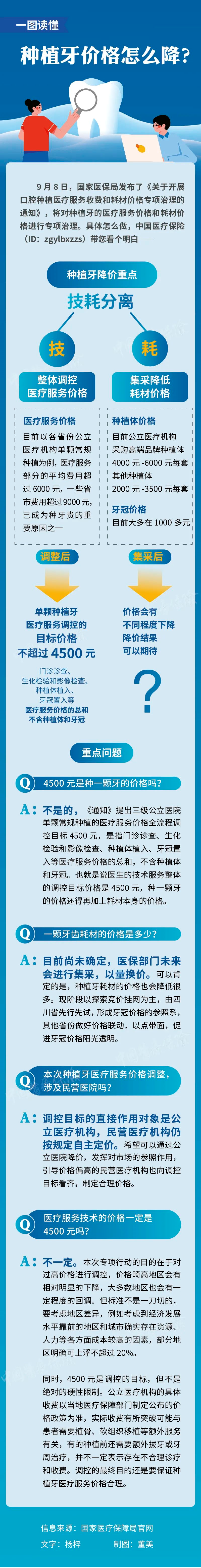 對于廣大患者關(guān)注的事,以后種一顆牙要花多少錢,需要綜合考慮醫(yī)療服務(wù)價格和耗材價格兩方面。根據(jù)醫(yī)保局今年發(fā)布的《關(guān)于開展口腔種植醫(yī)療服務(wù)收費和耗材價格專項治理的通知》,每顆種植牙的醫(yī)療服務(wù)費用調(diào)控目標(biāo)在4500元。當(dāng)然4500元的價格并不是“一刀切”的標(biāo)準(zhǔn),根據(jù)醫(yī)療服務(wù)的難度和各地的情況可能會有所不同。因此,患者種一顆牙到底降價多少,需要等待種植牙耗材集采結(jié)果出爐,兩相結(jié)合得出答案。