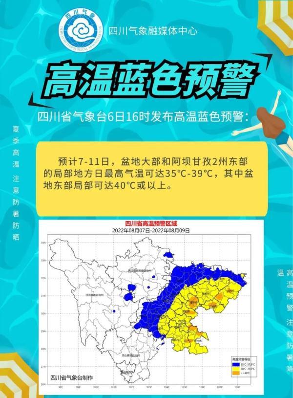 與此同時,6日下午,四川省氣象臺也發(fā)布了高溫藍色預(yù)警:預(yù)計7-11日,盆地大部和阿壩甘孜2州東部的局部地方日高氣溫可達35℃-39℃,其中盆地東部局部可達40℃或以上。