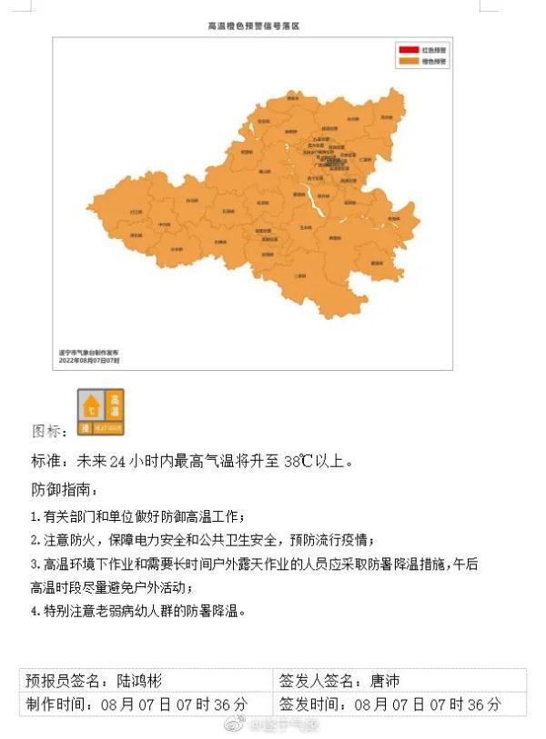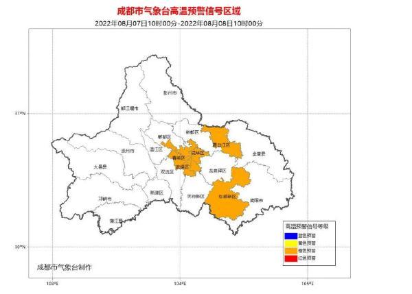 成都市氣象臺2022年08月07日10時00分發(fā)布高溫橙色預(yù)警信號:預(yù)計我市東部新區(qū)、錦江區(qū)、青羊區(qū)、武侯區(qū)、成華區(qū)、金牛區(qū)、高新南區(qū)、高新西區(qū)和青白江區(qū)的全部鎮(zhèn)(街道)未來24小時內(nèi)高氣溫將升至35℃以上,35℃以上高溫主要出現(xiàn)在12時至18時。請注意防暑降溫。