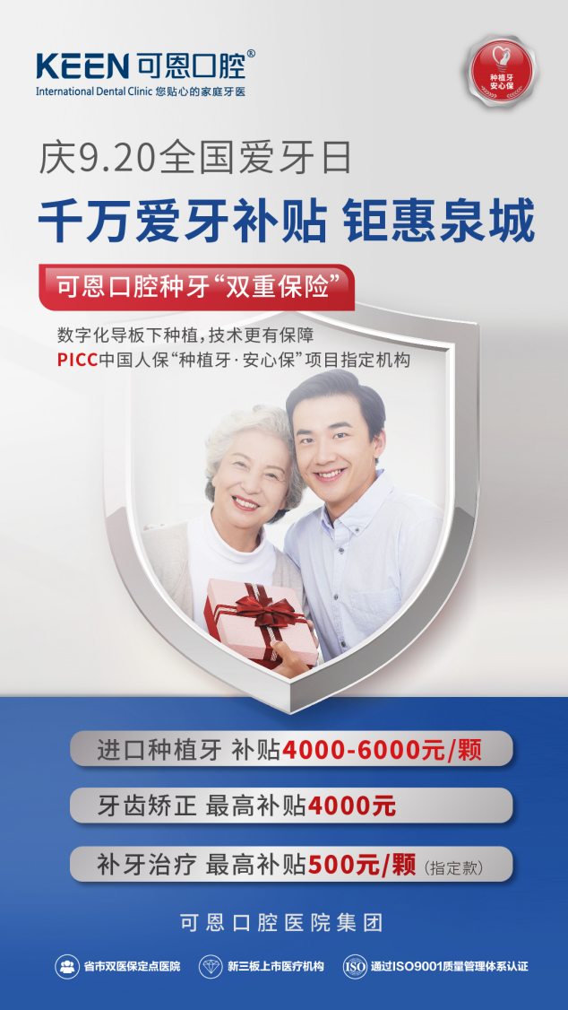 在9.20全國愛牙日來臨之際,為市民提供種牙“雙保險”的同時,可恩口腔醫(yī)院作為全國掛牌上市的口腔醫(yī)院(股權代碼:830938),特推出千萬愛牙補貼,即日起至9月30日,凡在可恩口腔醫(yī)院種牙,均可享受進口種植牙補貼4000-6000元/顆,并免除580元種植方案設計費,為市民提供看得見的種牙實惠。