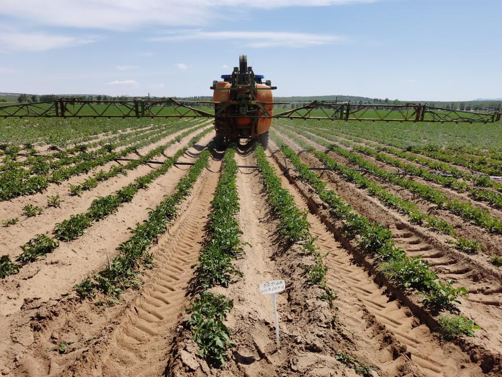 五寨縣現(xiàn)代加工型馬鈴薯種植示范基地里,農(nóng)民在對(duì)馬鈴薯進(jìn)行田間植保。(受訪(fǎng)者供圖)