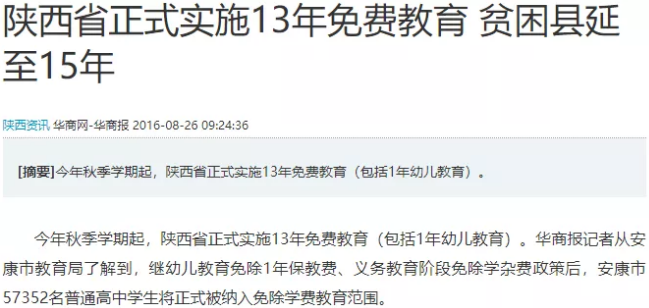 而放眼全國,此前四川、云南、河南等地亦有不少地區(qū)開始推行高中免學(xué)費(fèi)政策。陜西省更是宣布從2016年秋季學(xué)期開始全省高中教育免費(fèi),從而實(shí)現(xiàn)從學(xué)前1年到高中3年的13年免費(fèi)教育。