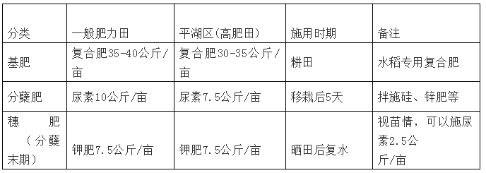 中低氮肥水平,每畝純氮一般不超過(guò)12.5公斤。平湖區(qū)或高肥田施肥量略減,氮磷鉀比2:1:1.5。