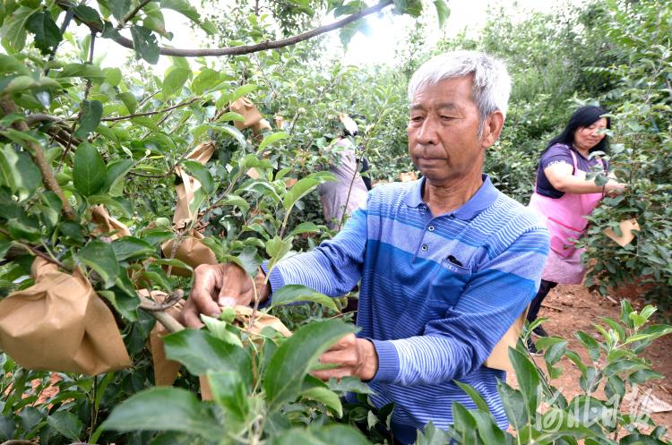 2020年6月1日,河北省曲陽(yáng)縣孫家莊村西旦溝現(xiàn)代農(nóng)業(yè)園區(qū)果園里,種植戶在給蘋果套袋。河北日?qǐng)?bào)記者杜柏樺攝影報(bào)道