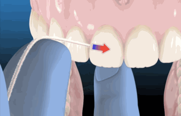 3. 用緩和的拉鋸樣動作,將牙線拉入兩牙之間,牙線輕輕通過兩牙之間接觸點,使牙線緊貼在牙面上,上下內(nèi)外牽動牙線,嵌塞的食物即可隨牙線的移動而被帶出。