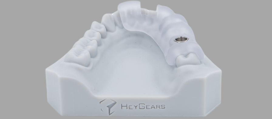 黑格科技通過3D打印技術(shù)制作的種植導(dǎo)板,透明部分可與患者牙齒嚴(yán)絲合縫,醫(yī)生通過預(yù)留的金屬孔洞鉆孔即可