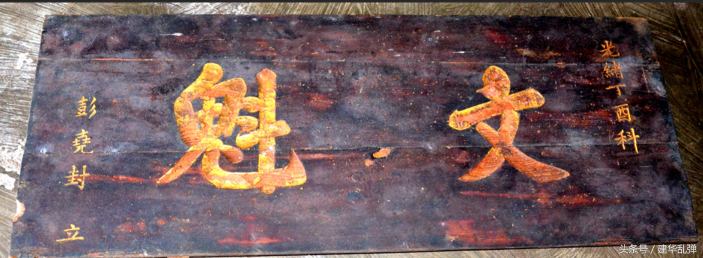 熱情的唐姓村民還保留了一塊寫有“文魁”寫匾額。老人說,原來堂屋里掛著一塊大匾和兩塊小匾,這是兩塊小匾中的一塊,大匾寫的什么不記得了,是誰拿走了也不知道,另一塊小匾也當(dāng)柴火燒掉了,現(xiàn)在看來是可惜了。小匾由三塊木板拼接而成,寬不足尺,長不足米,蟲眼密布,有字的部分蟲眼少,看來這些小動物對文化還是舍不得輕易破壞。匾中所書:光緒丁酉科 文魁 彭堯封 立”字,所有文字均以陰雕加漆金形式制作而成,均是筆劃圓潤,功力厚實的楷書體,“文魁”二字特別耀眼。聚資料顯示,文魁是古代科舉制度中對舉人的一種稱呼,清代鄉(xiāng)試考場設(shè)于各省稱貢院,于八月舉行,九月放榜,新科舉人第一名稱解元,第二名稱亞元,第三、四、五名稱經(jīng)魁,第六名稱亞魁,其余皆稱文魁。有人為激勵家人或后代,就立如此牌匾于家族之中,這匾上文魁是何人,立匾者又是何人?筆者至今未查閱核實到,敬請知悉者補正。