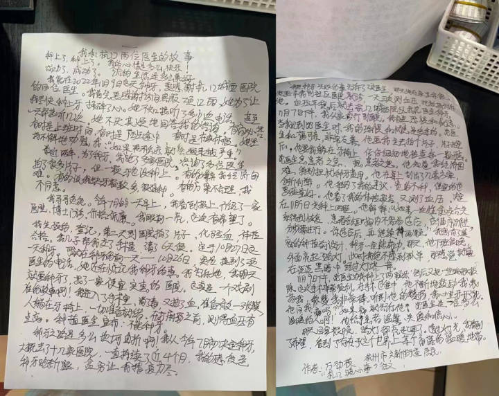 “我在報(bào)紙上看到醫(yī)患征文,我手寫(xiě)了一篇,來(lái)投稿啦!”萬(wàn)女士拿出寫(xiě)滿(mǎn)兩頁(yè)的感謝信,說(shuō)要夸一夸城西院區(qū)的項(xiàng)江麗護(hù)士和沈振華醫(yī)生。
