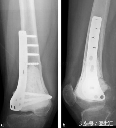 由于行軟骨下骨處植骨,故囑患者術(shù)后3個(gè)月,攝片示植骨愈合后,患肢開(kāi)始負(fù)重(圖29‐4a,圖29‐4b)。此患者已術(shù)后隨訪兩年,局部無(wú)復(fù)發(fā),胸部無(wú)轉(zhuǎn)移,植骨已愈合,功能良好。