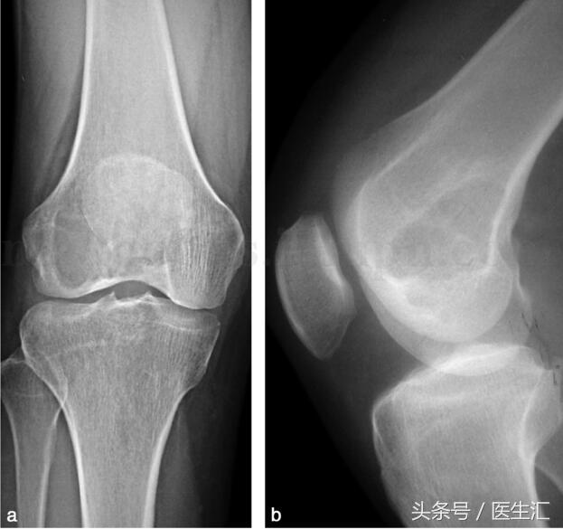 a﹒右股骨下段外髁部溶骨性骨破壞(X 線正位片);b﹒右股骨下段外髁部溶骨性骨破壞(X 線側(cè)位片)