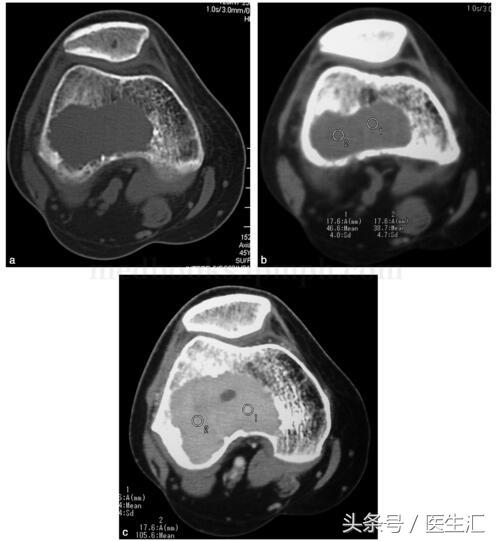 影像學(xué)檢查:X 線示右股骨遠(yuǎn)端骨端發(fā)生的一個(gè)偏心、基質(zhì)均勻、皮質(zhì)膨脹、皮質(zhì)無(wú)骨破壞、無(wú)骨膜反應(yīng)、無(wú)軟組織腫塊的溶骨性破壞(圖29‐1a,圖29‐1b)。CT 示右股骨遠(yuǎn)端骨端的溶骨性破壞,基質(zhì)均勻,注射造影劑后,病變強(qiáng)化,CT 值由強(qiáng)化前的40HU 增加到強(qiáng)化后的110HU(圖29‐2a~圖29‐2c)。