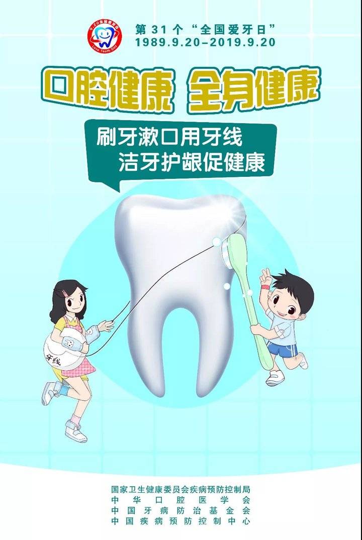2019年9月20日是第31個(gè)“全國愛牙日”。今年的愛牙日主題是“口腔健康 全身健康”,副主題是“刷牙漱口用牙線 潔牙護(hù)齦促健康”,以口腔健康與全身健康的關(guān)系為切入點(diǎn),加大口腔健康科普宣傳力度,提高群眾口腔健康意識(shí),建立自我口腔健康行為,營造有利于口腔健康的良好社會(huì)氛圍。