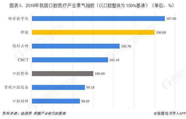 口腔醫(yī)療行業(yè)作為消費升級的重點領域,隨著國民可支配收入的提升和健康、美觀意識的增強,整個市場也在不斷前進增長。根據(jù)衛(wèi)生健康委國際交流與合作中心聯(lián)合醫(yī)趨勢發(fā)布的《2019年中國口腔產(chǎn)業(yè)趨勢報告》,椅旁數(shù)字化、種植、隱形正畸的產(chǎn)業(yè)景氣指數(shù)排名前三,高于口腔整體行業(yè)水平,說明數(shù)字化、種植和隱形正畸在成長性、創(chuàng)新性、經(jīng)營指標和景氣信心方面具有優(yōu)異的發(fā)展前景。