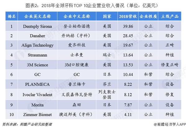 隨著市場需求的增大和政策的加持,牙科巨頭的競爭愈發(fā)激烈。2018年0的企業(yè)總營收占牙科市場52%的市場份額,其中有5家美國企業(yè),集中度較高。在2018年牙科企業(yè)營收規(guī)模排名中,有兩家主線產(chǎn)品為種植牙的企業(yè),分別是瑞士的士卓曼和美國的捷邁邦美(牙科),分別以13.64億美元和4.11億美元的營收排名第4和第10名。