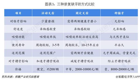 目前常用的缺牙修復方式主要有3種,分別是活動義齒、固定義齒和種植牙?;顒恿x齒即通常所說的假牙,這種方式價格便宜、制作簡單、磨除牙體組織少,但是異物感強、穩(wěn)定性較差、咀嚼功能受限、存在口腔衛(wèi)生問題等;固定義齒,即烤瓷牙,則是通過把缺失牙兩邊的健康牙磨小,變成“橋墩”,來架住缺失的牙齒。這種方式不需要頻繁摘下清洗,咀嚼功能較強,無異物感。缺點是需要磨損天然牙齒,對剩余鄰牙要求高;種植牙與前兩種方式相比,不損傷正常牙齒,咀嚼功能類似天然牙,舒適美觀,使用周期長,是目前果好的缺牙修復方式。但種植手術相對復雜,種植牙費用高。