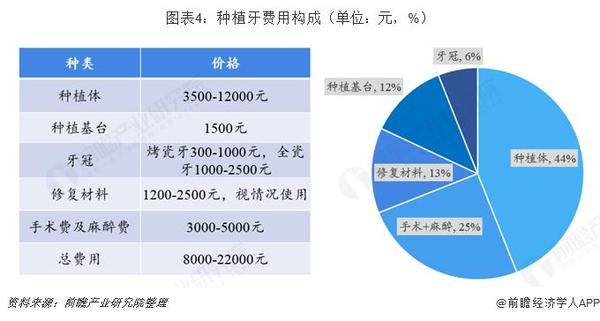 目前國內(nèi)市場上種植牙手術的費用大概在8000-22000元,其中種植體作為核心材料,費用高,一般達到3500-12000元,占整個手術費用的44%。其次為手術費+麻醉費3000-5000元(25%),修復材料1200-2500元(13%),種植基臺1500元(12%),牙冠分烤瓷牙300-1000元,或全瓷牙1000-2500元(6%)。