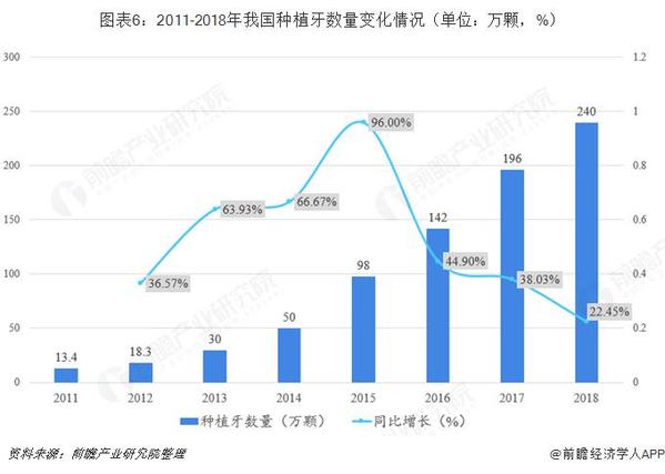 2011年我國種植牙數(shù)量僅有13.4顆,2018年我國種植牙數(shù)量已達到約240萬顆,2011-2018年復合年增速超過50%,處于滲透率快速提升的階段。
