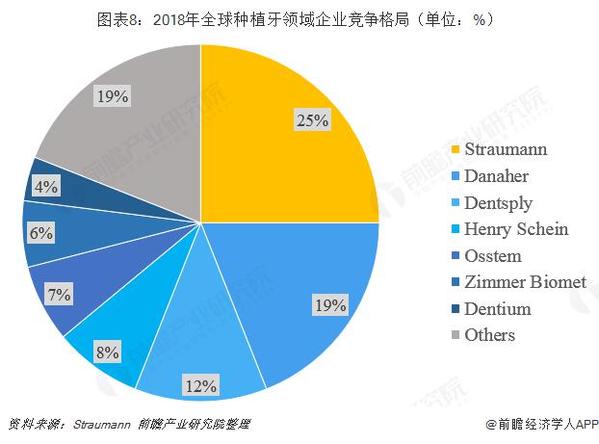 根據(jù)Straumann的數(shù)據(jù),種植牙領域維持20%左右的高增長,2018年種植牙領域上游市場規(guī)模約為45億美元,同比增長21.6%。從競爭格局來看,Straumann以25%的市占率位居榜首,其次為Danaher(Nobel Biocare母公司)占據(jù)19%市場,其余種植牙企業(yè)市占率均低于10%。