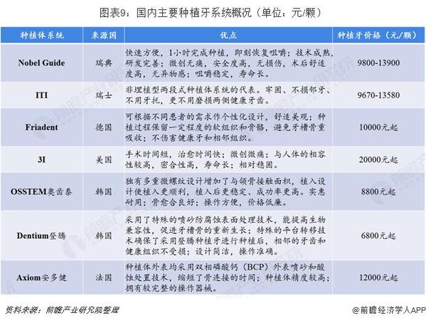 目前國內(nèi)市面上常見的種植牙系統(tǒng)如下。歐美的種植牙系統(tǒng)主要走中高端路線,如口碑較好、較為流行的瑞典Nobel Guide和瑞士ITI,其研發(fā)種植體較早,擁有大量的臨床數(shù)據(jù),價格也貴,在9500-14000元/顆之間;低端主要為韓國種植牙系統(tǒng),質(zhì)量稍低于中高端種植體,種類多樣,價格在6500-9000元/顆之間,性價比較高。