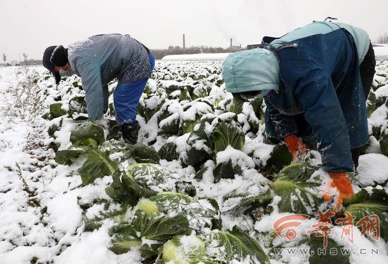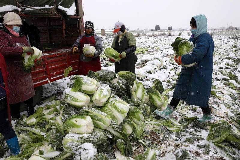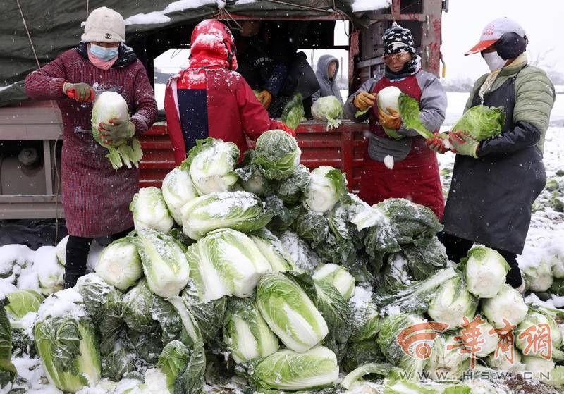 冰天雪地,大家在菜地里忙碌。大白菜被收好后,裝到了一輛大貨車上。在一處大棚里,大家正在收割小青菜,收好后裝筐。