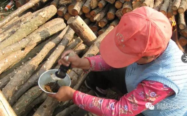 人工接種是栽培黑木耳成敗的關鍵工序,也是新法栽培大的特點。接種時間,一般以氣溫穩(wěn)定在15℃以上,有利于黑木耳菌絲生長的時候。具體時間因各地氣候條件不同而有差異,南方各省約在3~4月間。適當提早接種,有利早發(fā)菌,早出耳,同時早期接種氣溫低,可減少雜菌,害蟲的感染。接種前,先將段木表面清洗,再放陽光下曬2~3小時后備用。人工接種常用的菌種有木屑菌種、樹枝菌種和楔形木塊菌種。接木屑和樹枝菌種的,要用電鉆或直徑11~12毫米的皮帶沖 打孔,穴探15~2厘米。一般縱向種穴間距離10~12厘米,橫向種穴間距離為4~6厘米。如適當密植,把縱向種穴間距離縮短至6~7厘米,有利于發(fā)菌和提高產(chǎn)量。行與行的穴交 錯成品字形或梅花形排列。木屑菌種要塞滿穴,外加比接種穴直徑大2毫米的樹皮蓋,蓋平、蓋緊,以防菌種干燥。接樹枝菌種的,種木要與耳木平貼。打穴、接種、蓋蓋等要連續(xù)作業(yè),以保持接種穴、菌種和樹皮蓋原有的濕度,才有利于菌種的成活。采用楔形木塊菌種的,要用接種斧或木工鑿,在段木上砍鑿成45°角2厘米深的接種口,然后用小鐵錘將楔形木塊菌種打入接種口,錘緊、錘平。