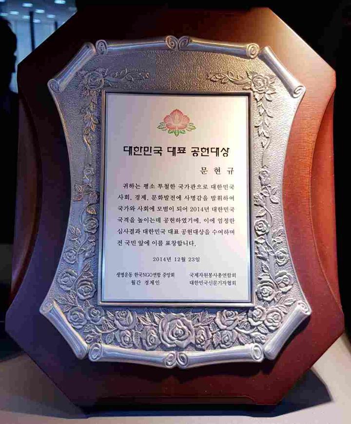 仁川正正種植牙齒科集團(tuán)醫(yī)院代表院長文現(xiàn)圭,榮獲的大韓民國代表奉獻(xiàn)大獎(jiǎng)榮譽(yù)稱號(hào)獎(jiǎng)牌。