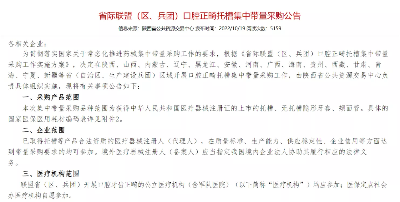 近日,陜西省公共資源交易中心發(fā)布《省際聯(lián)盟(區(qū)、兵團(tuán))口腔正畸托槽集中帶量采購公告》,決定在15省(自治區(qū)、生產(chǎn)建設(shè)兵團(tuán))區(qū)域開展口腔正畸托槽集中帶量采購工作。這是繼種植牙后,又一牙科醫(yī)用耗材被納入集采范圍。