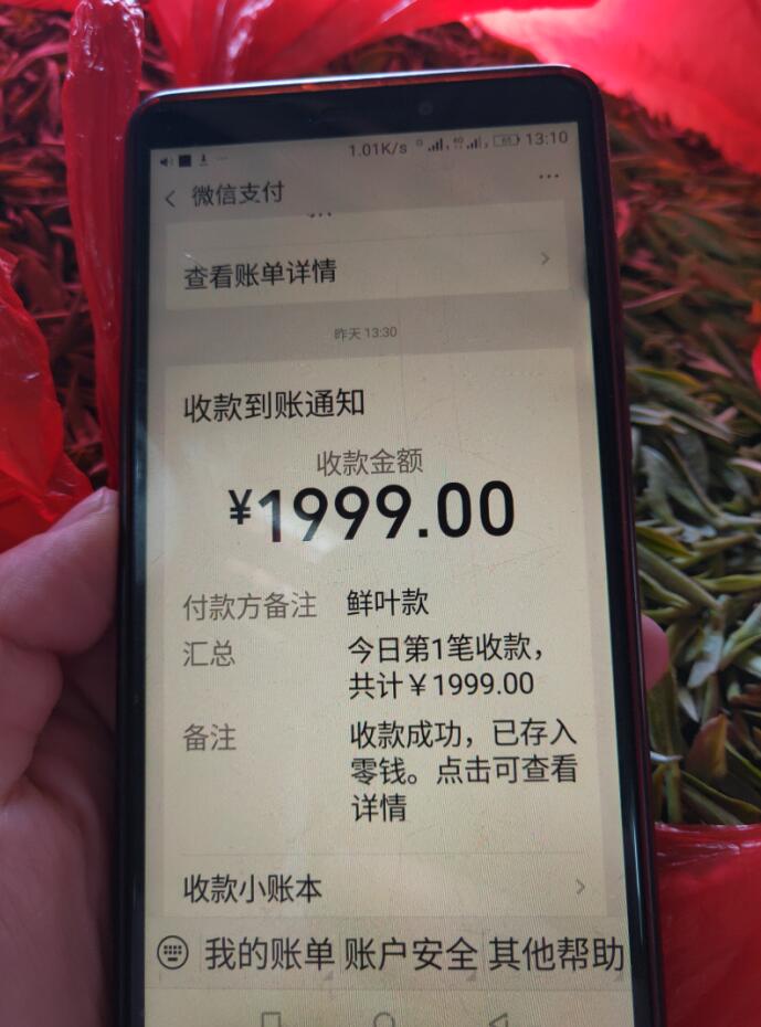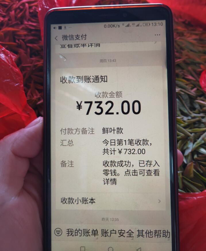 13號上午大半天收入1999元,當天價格高達120元/公斤,早上5點多進茶園。