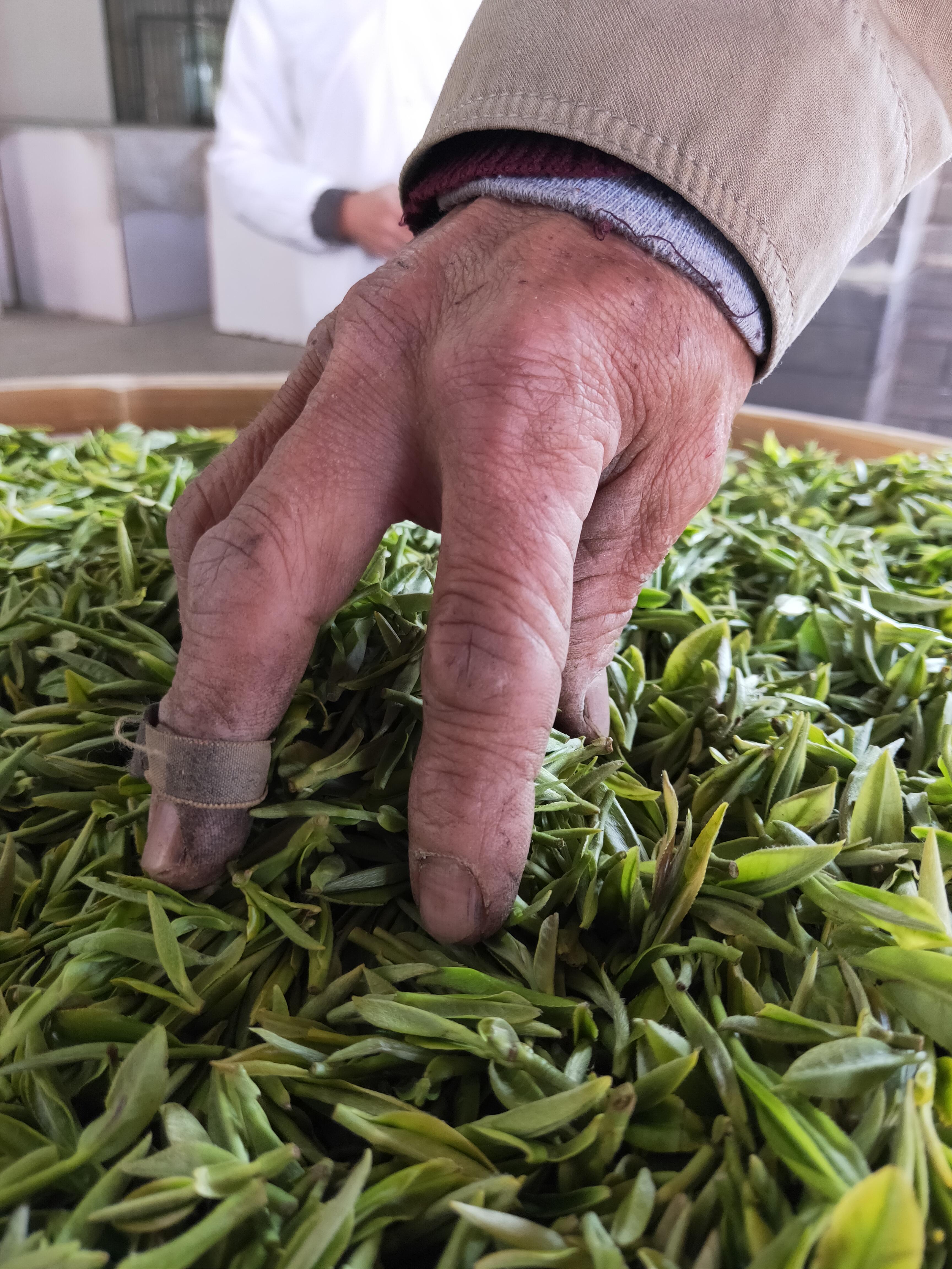 看看他的這雙手,布滿裂口,還纏著創(chuàng)可貼,可見采茶是多么辛苦!