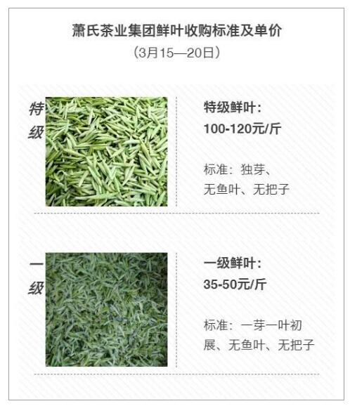 鄧村鄉(xiāng)是”中國名茶之鄉(xiāng)“,當地龍頭茶企——蕭氏茶業(yè)集團,自3月5日開園以來,嚴格履行“不壓價、不限購、不欠款”三大承諾,按質論價、優(yōu)質優(yōu)價,劃分出“特級、一級”兩個等級和價格,要求茶農按照“無人工廠”的高標準原料需求采摘優(yōu)質鮮葉,其中,特優(yōu)級單芽價格每市斤達120元。