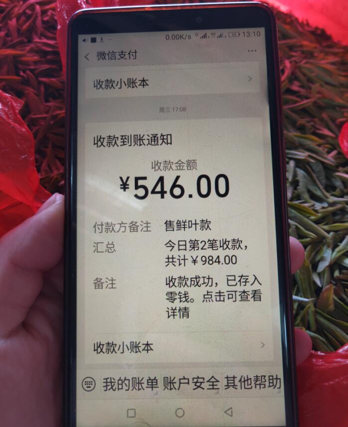 “1083塊!收到了”, 譚復明大聲念出了手機微信收付款界面上的金額。他是鄧村鄉(xiāng)小漁村三組村民,這是他今天上午半天全家5人的采茶成果,共19斤7兩,令他驚喜的是,他的茶葉今天竟然賣到110元每公斤的好價錢。這個半天再加上前三天在蕭氏鮮葉收購站的賣茶收入(11號1400多元、12號1900多元、13號2400多元、14號上午1083元),累計已近7000元,和去年同期收入持平。