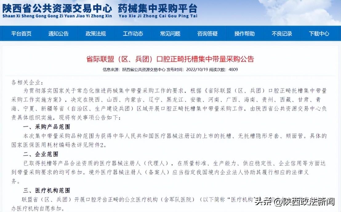 10月19日,陜西省公共資源交易中心-藥械集中采購平臺(tái)發(fā)布新《省際聯(lián)盟(區(qū)、兵團(tuán))口腔正畸托槽集中帶量采購公告》。公告顯示本次帶量采購工作將由陜西、山西、內(nèi)蒙古、遼寧、黑龍江、安徽、河南、廣西、海南、貴州、西藏、甘肅、青海、寧夏、新疆等15?。ㄗ灾螀^(qū)、生產(chǎn)建設(shè)兵團(tuán))聯(lián)合開展。