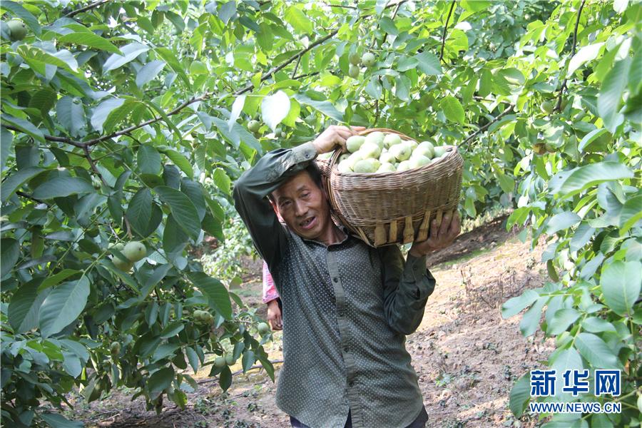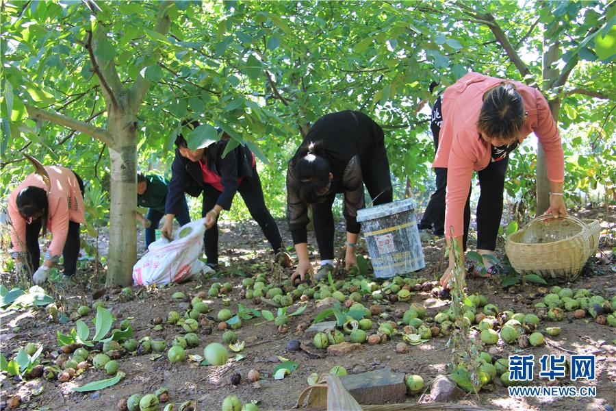 ??悼h皮家坡村核桃基地里,農(nóng)戶在采摘核桃 新華網(wǎng)發(fā) 楊先鶴 攝