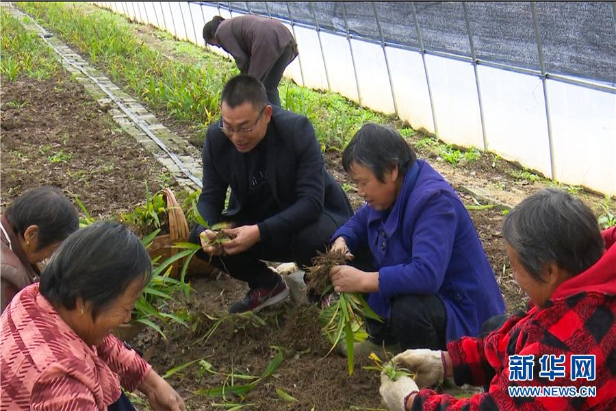 謝輝同員工一起移栽中藥材種苗 新華網(wǎng)發(fā) 周龍 攝