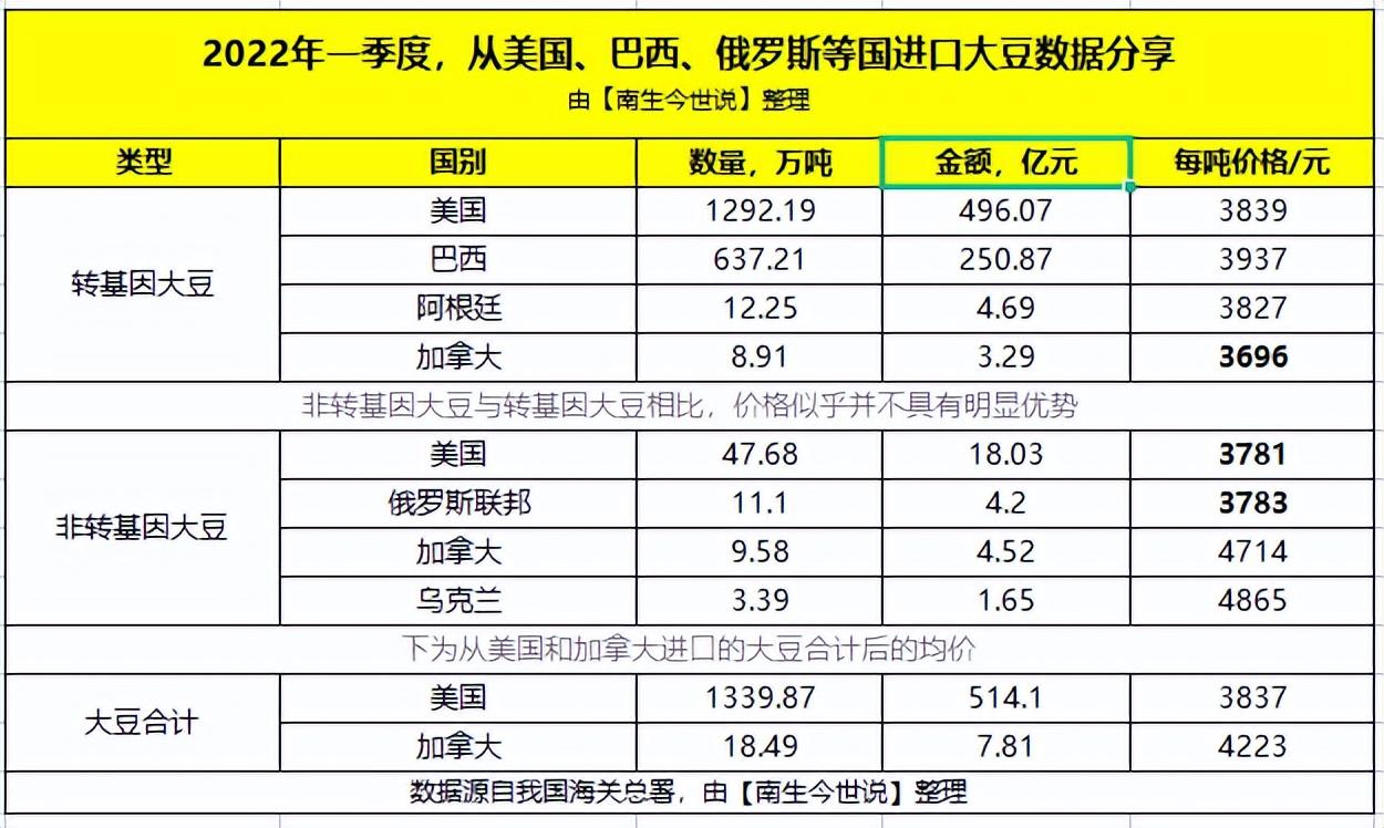南生將海關(guān)總署公開的信息匯總后發(fā)現(xiàn):今年一季度我國從美國、巴西、阿根廷、俄羅斯、加拿大、烏克蘭等國進(jìn)口的大豆價格(到岸價)差異較大。其中,加拿大非轉(zhuǎn)基因大豆的價格,遠(yuǎn)遠(yuǎn)超過了轉(zhuǎn)基因大豆。