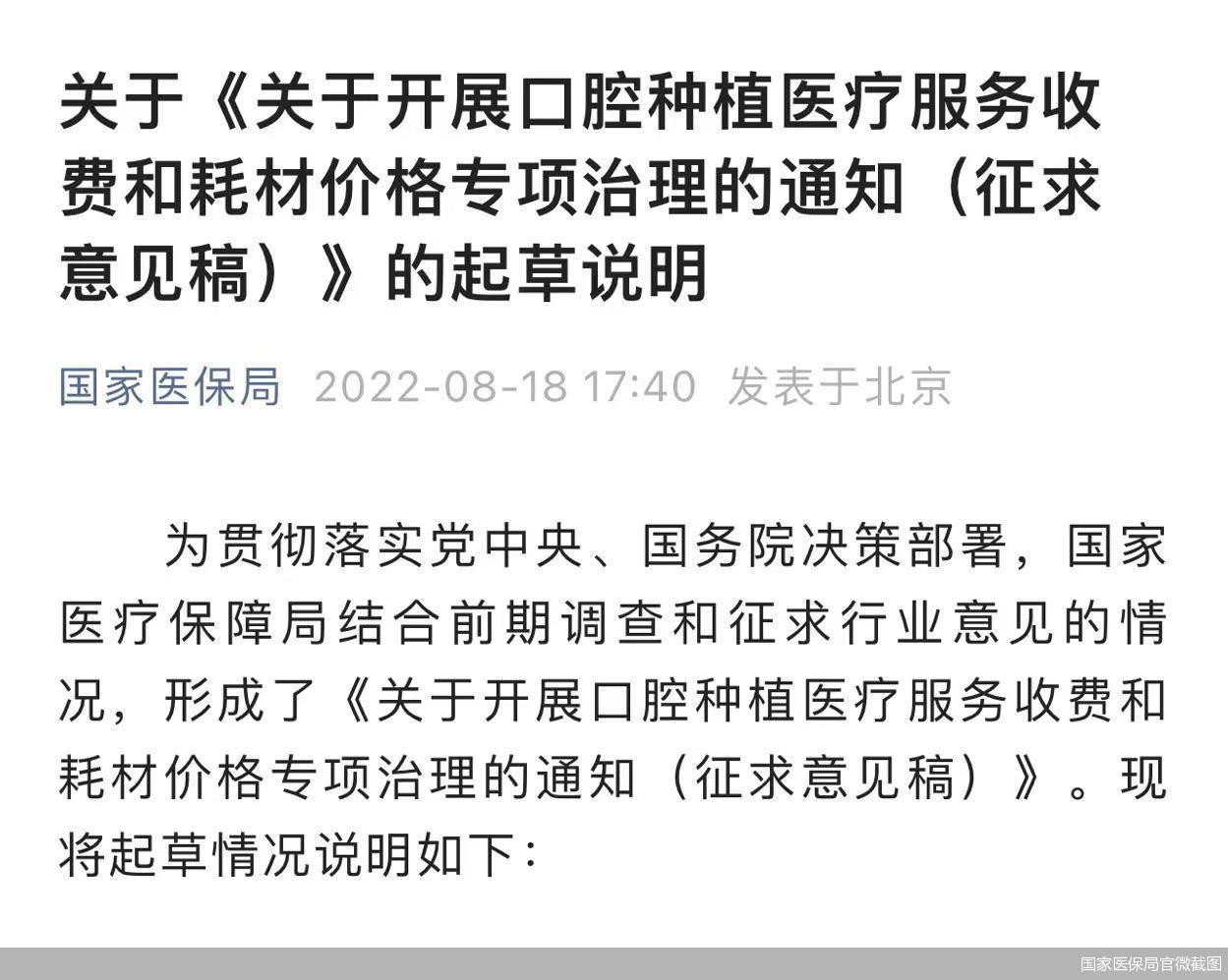 8月18日,醫(yī)療保障局就《關(guān)于開(kāi)展口腔種植醫(yī)療服務(wù)收費(fèi)和耗材價(jià)格專項(xiàng)治理的通知(征求意見(jiàn)稿)》(以下簡(jiǎn)稱《意見(jiàn)稿》)公開(kāi)征求意見(jiàn)?!兑庖?jiàn)稿》從引導(dǎo)種植牙牙冠形成合理價(jià)格,到規(guī)范整合口腔種植價(jià)格項(xiàng)目等十二個(gè)方面面向社會(huì)公開(kāi)征求意見(jiàn),截止時(shí)間為2022年8月27日。長(zhǎng)期以來(lái),口腔種植領(lǐng)域收費(fèi)不規(guī)范、費(fèi)用負(fù)擔(dān)重,成為困擾群眾的民生痛點(diǎn)。隨著《意見(jiàn)稿》的披露,種植牙集采箭在弦上。