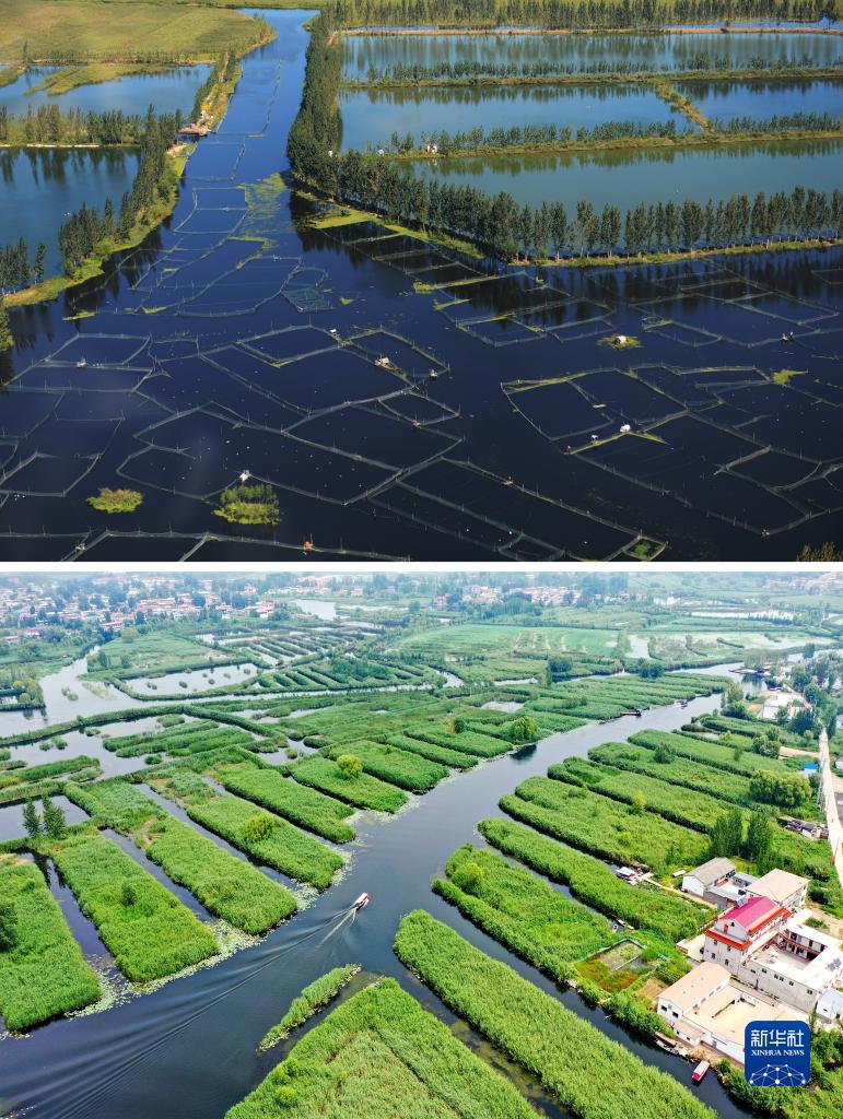 拼版照片:上圖為2012年9月29日拍攝的白洋淀(金潔 攝);下圖為2021年8月14日拍攝的白洋淀風(fēng)光(無人機(jī)照片,新華社記者牟宇攝)。