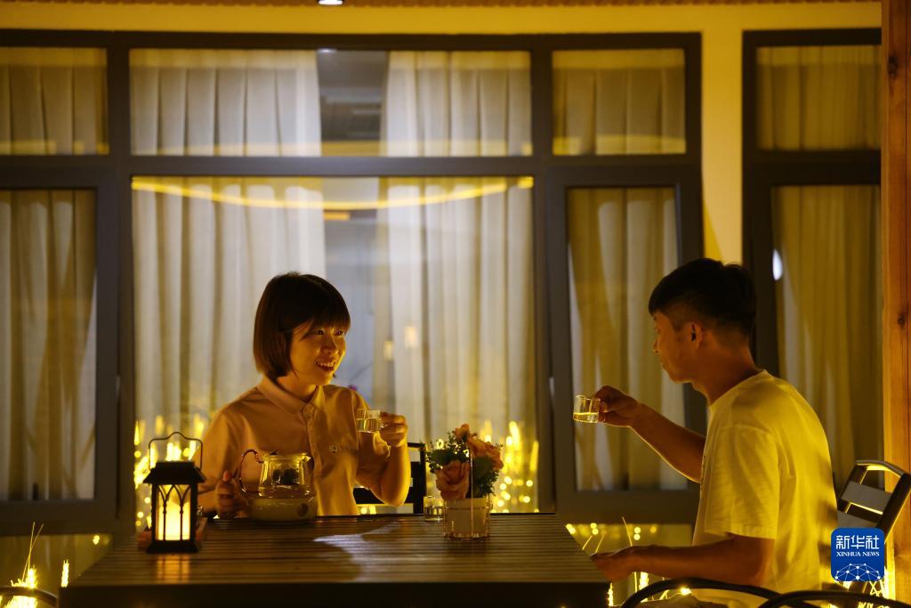 2022年9月6日,在雄安新區(qū)經(jīng)營民宿的雄安人韓星(左)在和客人交流。