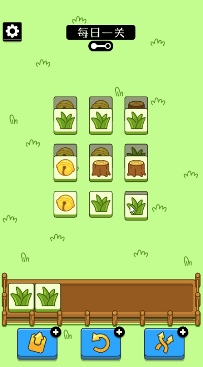 整個(gè)游戲一共就兩關(guān),玩家通過點(diǎn)選圖案放入卡槽對(duì)卡牌進(jìn)行消除,卡槽可放7張牌,3張相同的圖案即可完成消除。