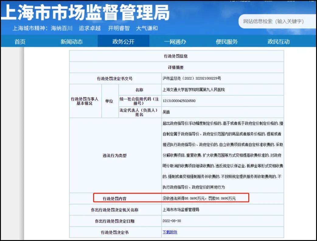 近日,上海市市場(chǎng)監(jiān)督管理局發(fā)布的一則行政處罰信息顯示,上海交通大學(xué)醫(yī)學(xué)院附屬第九人民醫(yī)院(下稱上海九院)因不執(zhí)行政府指導(dǎo)價(jià),被罰沒(méi)176萬(wàn)余元。