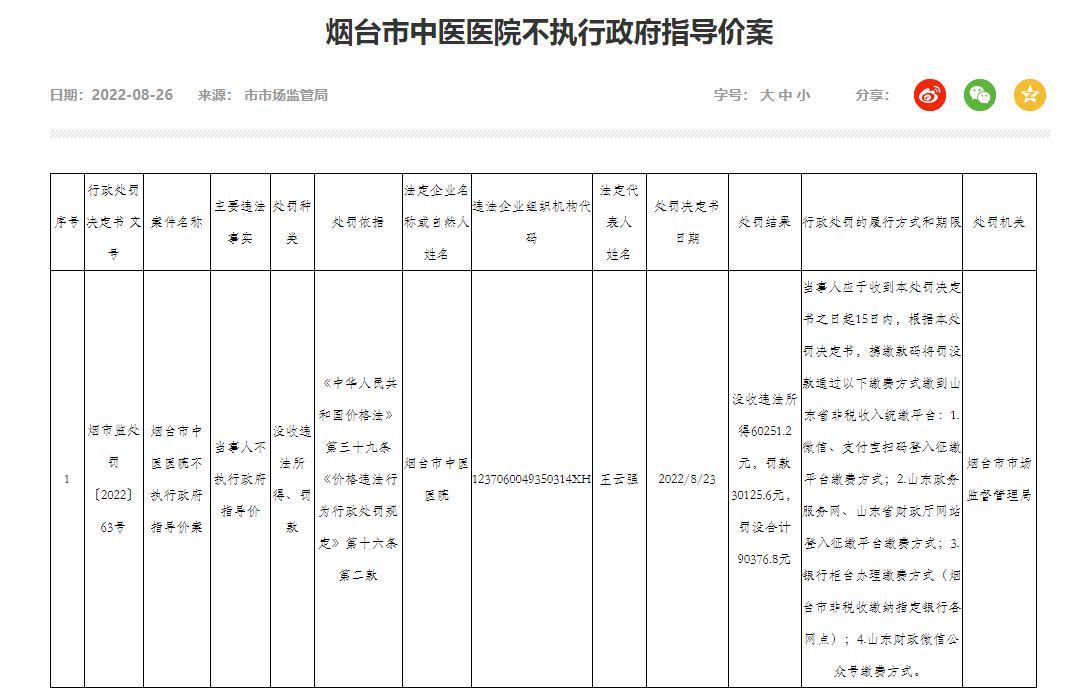 2022年4月20日,靈臺(tái)縣市場(chǎng)監(jiān)督管理局依法對(duì)靈臺(tái)縣人民醫(yī)院未執(zhí)行政府指導(dǎo)價(jià)違規(guī)收費(fèi)的違法行為,給予沒(méi)收違法所得11.35萬(wàn)元、罰款11.35萬(wàn)元的行政處罰。2022年5月,深圳市市場(chǎng)監(jiān)督管理局網(wǎng)站公布一則行政處罰信息,深圳市寶安區(qū)人民醫(yī)院被深圳市市場(chǎng)監(jiān)督管理局寶安監(jiān)管局罰款10985.85元,并沒(méi)收違法所得。2022年8月,煙臺(tái)市市場(chǎng)監(jiān)督管理局公布處罰信息,煙臺(tái)市中醫(yī)醫(yī)院因不執(zhí)行政府指導(dǎo)價(jià),被沒(méi)收違法所得60251.2元,罰款30125.6元。